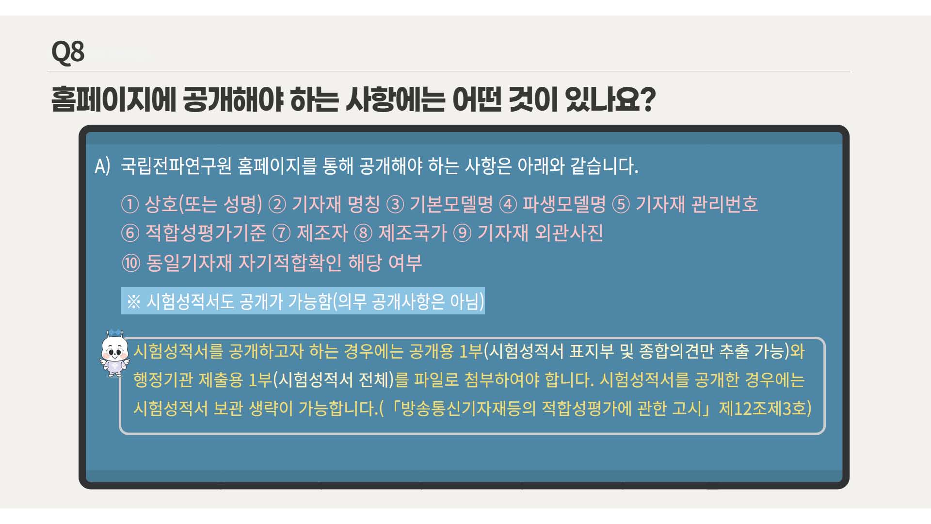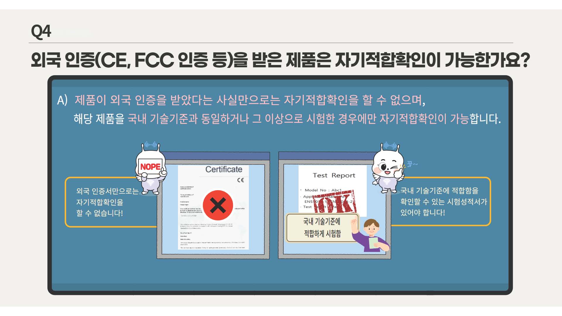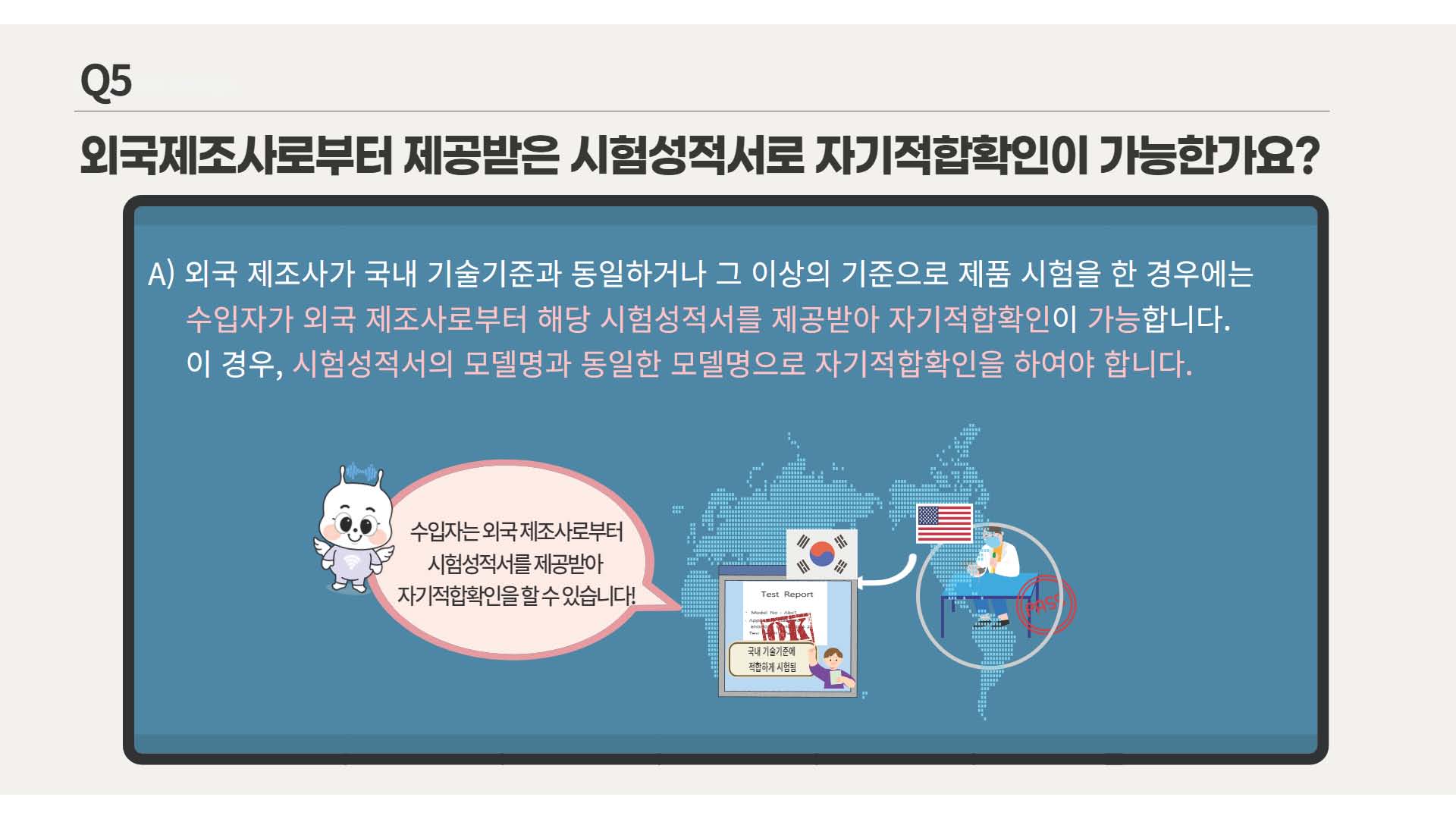 "외국 제조사가 국내 기술기준과 동일하고 나 그 이상의 기준으로 제품 시험을 한 경우에는 수입자가 외국 제조사로부터 해당 시험성적서를 제공받아 자기적합확인이 가능합니다. 다만 시험성적서의 모델명과 동일한 모델명으로 자기적합 확인을 하여야 합니다.